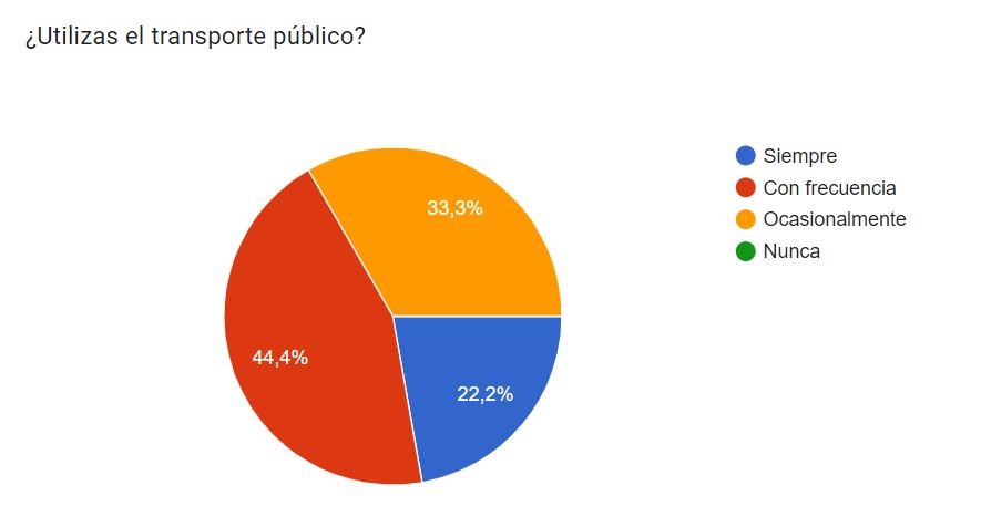 A través de las encuestas realizadas, se ha logrado recopilar información valiosa que arroja una perspectiva más profunda sobre las experiencias y necesidades de las personas con discapacidad visual en relación con el transporte público. Uno de los hallazgos más significativos es que todos los participantes con discapacidad visual dependen del transporte público como su principal medio de desplazamiento como se muestra en la figura 1. Este hallazgo resalta la importancia vital de abordar las deficiencias en la accesibilidad del transporte público para este grupo demográfico, ya que su movilidad y participación en la sociedad dependen en gran medida de la eficacia y adecuación de este servicio.