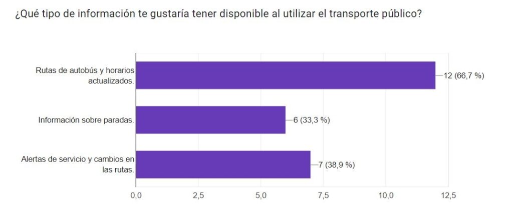 Existe una variedad de necesidades y preferencias entre las personas con discapacidad visual en relación con el transporte público. La falta de información sobre rutas, horarios y paradas parece ser un desafío común (figura 2). Además la mayoría de los encuestados encuentran útiles los comandos de voz y la integración con sistemas de información en tiempo real.